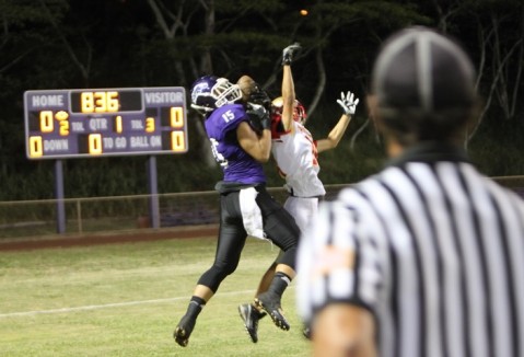 Garrett Kanamu fights off a Roosevelt defender to hall in a 25 yard pass from QB Jordan Taamu that