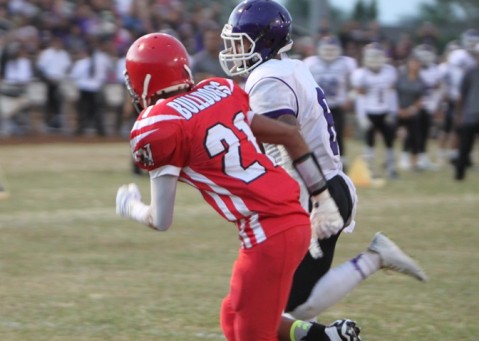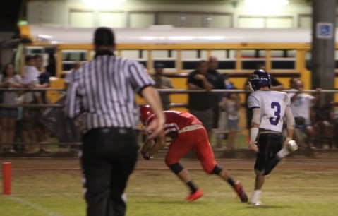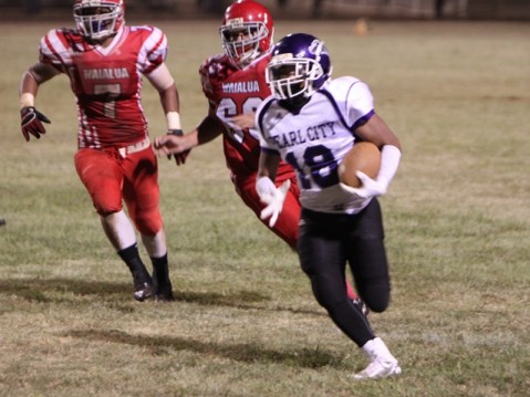 Dominic Maneafaiga heads towards the end zone just out of the reach of Waialua DB Keaka Cleveland in