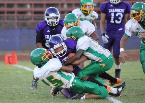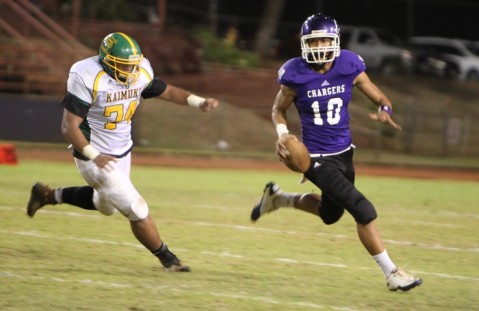 Pearl City's Dominic Maneafaiga led a potent Chargers offense scoring four touchdowns in a 46-13 blow out over the visiting Kaimuki Bulldogs last night at Edwin "Bino" Neves Stadium. The Chargers remain unbeaten in league play at 3-0.