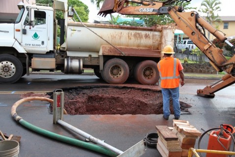 This is the second water main break in the area in less than a week. Last week Friday, BWS crews repaired the same 8-inch water main line about a 100 feet east of  today's early morning break that occurred in the eastbound lane near the Komo Mai Drive and Hoolaulea Street intersection.