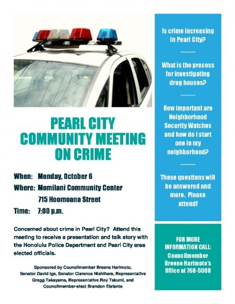 Mahalo to State Senator Breene Harimoto for providing the Pearl City Community on Crime" meeting information.