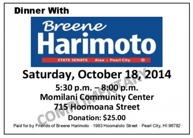 Dinner with State Senator Breene Harimoto scheduled for tomorrow, Saturday, October 18 has been cancelled.