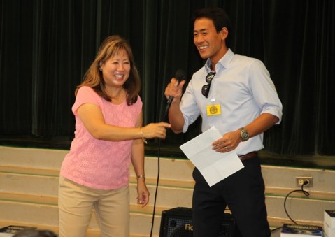 Gus Webling third grade teacher Mrs. Lynn Yasutomi hands her son Clifton Yasutomi, Pearlridge