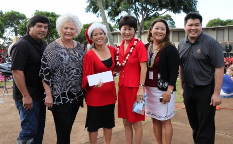 Yesterday morning, December 17, Kanoelani Elementary School became the second Pearl City District Complex Elementary School, this school year, to receive 10 – $100.00 gift certificates from the Pearl City Shopping Center (PCSC) Merchants Association.