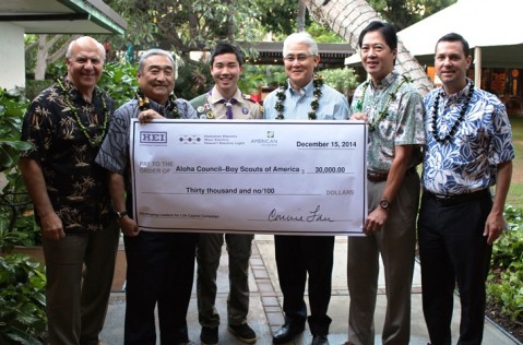 Hawaiian Electric Industries Charitable Foundation has contributed $30,000 to the Aloha Council, Boy Scouts of America (BSA). The nonprofit organization – which trains and develops youth in responsible citizenship, character development and self-reliance – will use the HEI Charitable Foundation grant to support its Developing Leaders for Life Capital Campaign. Hawaiian Electric Industries is the parent company of American Savings Bank, Hawaiian Electric, Maui Electric and Hawaiʻi Electric Light.