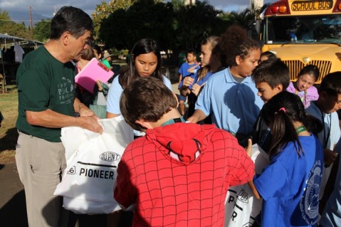 CTAHR Manager, Ray Uchida assists in passing out collection bags for the arriving