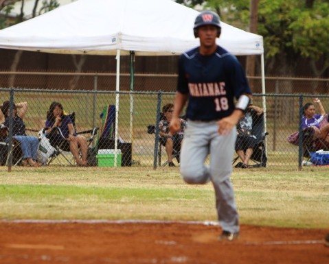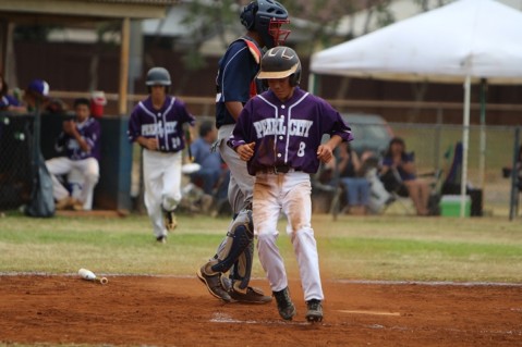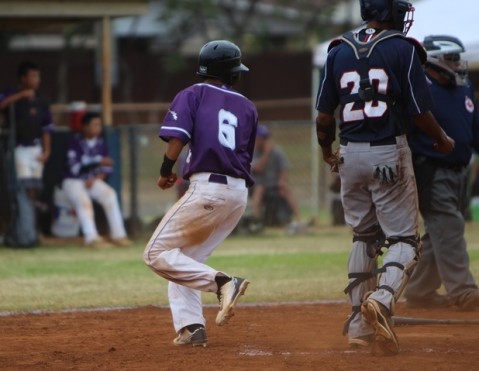 Tavita Lalau scores from second base on Ejay Kuakini's RBI single in bottom of the fourth inning.