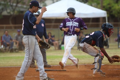 Tyler Kushima scores on the front end of Sanyo Lo's 2-RBI double in the top of the fifth inning.