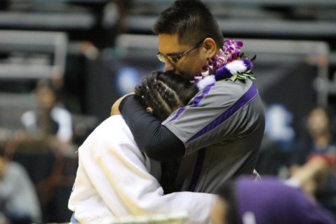 Lady Chargers teammates Sarah Kaaiakamanu (left) and Kayelah Arakaki (right) embrace