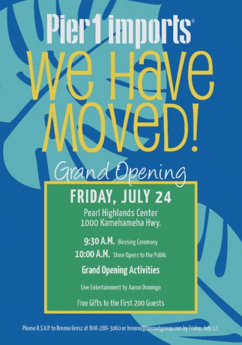Pier 1 Imports will open its newest store in Pearl City with an official grand opening ceremony on Friday, July 24., at 9:30am. The new store has is approximately 9,294 square feet and is a relocation of its former location within the Pearl Highlands Center at 1000 Kamehameha Hwy.