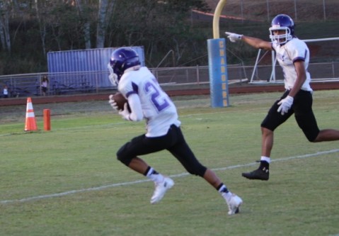 Pearl City wide receiver Patrick Nunez scores on a TD toss from QB Kekainalu Simon.