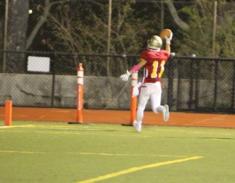 Roosevelt's Shayne Teruya scores on a 13 yard touchdown pass from QB Shastyn Kekahuna with