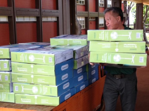 Pearl City High School received the first of two deliveries of free fans on Friday, September 18, 2015 from the organizers of the “Fans From Fans” PCHS fan drive. Fans From Fans supporter City Mill delivered 108 fans that were received by PCHS vice-principal Herman Leong . The fans will make their way to the classrooms to help cool down the students during the summer heat wave that has fallen on the state. The fans were made available from the generous support of our community and City Mill.