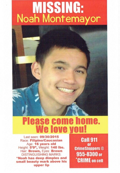 The search continues for missing teen Noah Montemayor who was last seen on Tuesday evening, September 29, 2015 at 9:00pm at his home in Hawaii Kai. He was reported missing Wednesday morning. Noah is 16 years old and attends Punahou School. He was reported to have been seen by a classmate on Tantalus on Friday. Family and friends are circulating the flyer below to help find Noah.