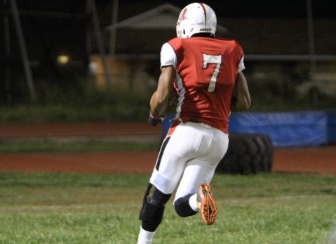 Pearl City QB Isaiah Asinsin looks into the end zone and