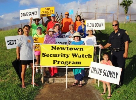 Volunteers from the Newtown Security Watch Program and Pearl City community, joined HPD Officer K. Godinet from the District 3 Pearl City Community Policing Team in the sign waving event on Kaahele Street fronting the entrance to the Newtown Recreation Center.