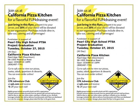 Please support Pearl City High School PTSA Project Graduation! 20% of your check at the California Pizza Kitchen, Pearlridge Mall (Downtown) location will be donated to PCHS Project graduation. The fundraiser runs from 10:30am – 10pm, today, Tuesday, October 27, 2015.