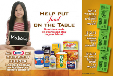 Check-Out Hunger is an annual holiday campaign sponsored by Kraft Foods in Hawaii. During the months of November, December and January, local retailers display bright green coupons that make it easy for you to donate right at check-out.