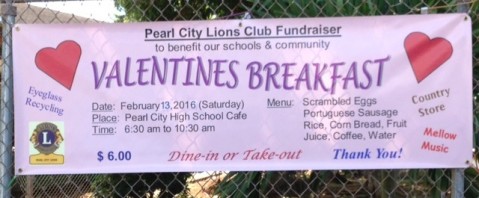 The Pearl City Lions Club is holding their Annual Valentines Breakfast Fundraiser to benefit our schools and community, tomorrow morning, Saturday, February 13 from 6:30am – 10:30am at the Pearl City High School cafeteria.