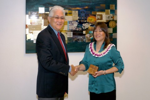 Hawaiian Electric President Alan Oshima is pictured presenting Hawaiian Electric