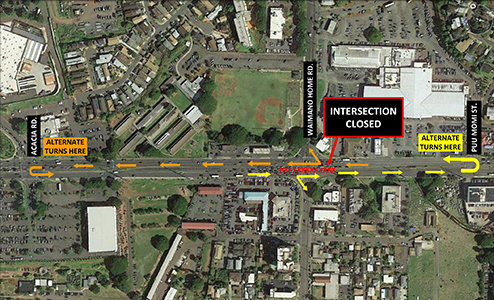 - On Wednesday, 3/23, Thursday, 3/24 and Monday, 3/28, there will be a 24-hour intersection closure of Waimano Home Road. Again, this means there will be no left turns from eastbound or westbound Kamehameha Highway and no crossing Kamehameha Highway at the Waimano Home Road intersection.