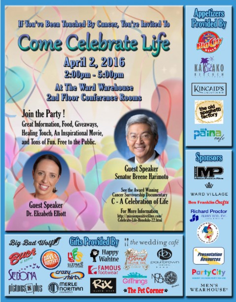 Join Senator Breene Harimoto at the" Come Celebrate Life" event this Saturday, April 2 at the Ward Warehouse second floor conference rooms. The event runs from 2:00pm – 5:00pm and is free to the public.