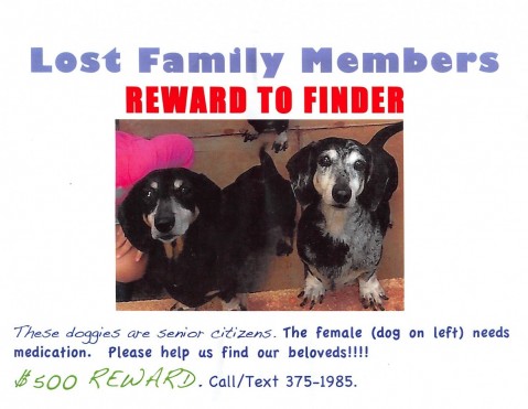 Please help find these lost family members. The following poster below was posted at the Momilani Community Center (715 Hoomoana Street, Pearl City) on Friday, April 1. A couple of very special family dogs are lost in the neighborhood and the owners are asking the Pearl City community to help them find their way back home. A $500 reward is being offered for information that leads to their safe return.