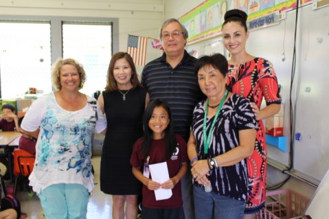 Award presenters, Charlene Ikeda, Dick Mosko, and Jaci Agustin and  Mrs. Joy Shigemasa (teacher).