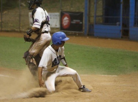 Colby Hirano slides in safely at home plate to score the first run of the ball