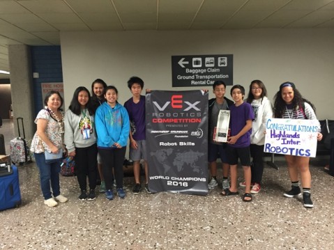 Highlands Intermediate Robotics team (under the direction of Ms. Okai) competed in the 2016 VEX Worlds – VEX Robotics Competition Middle School Division this past week (April 20 – 23) in Louisville, Kentucky. They made it to the quarter finals, falling in the second round to teams from Beijing, China. A total of 102 teams competed representing the USA, and other nations (i.e. China, S. Korea, Singapore, Puerto Rico, Mexico, Bahrain, Canada).