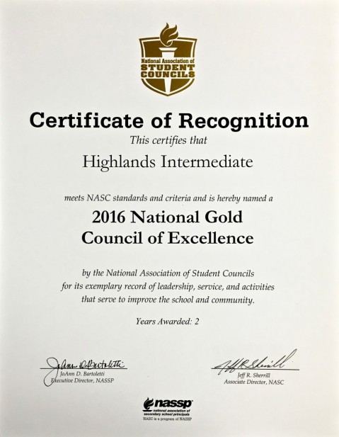 Highlands Intermediate Receives National Student Council Award For 2nd Straight Year!