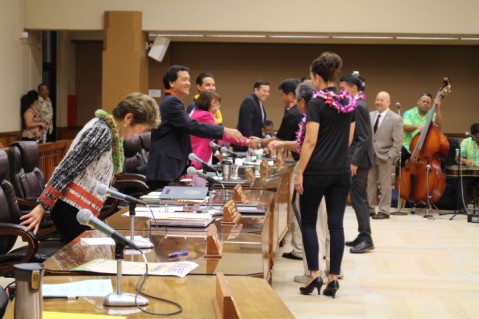 left, while Honolulu City Council Chairman Ernie Martin is pictured at the podium.