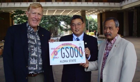 Allen Hoe looks on as Mary Jo Brostrom affixes the first Hawaii Gold Star