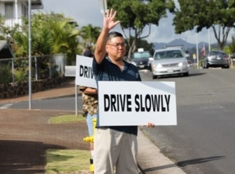 Representative Gregg Takayama fronting PEACHES on Waimano Home Road.