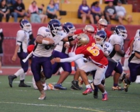 John Tuiletufuga powers his way through a Roosevelt defender in the Chargers junior varsity