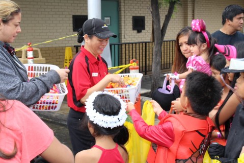 McDonald's staff members generously fill the bags of the excited keiki Trick or Treaters.