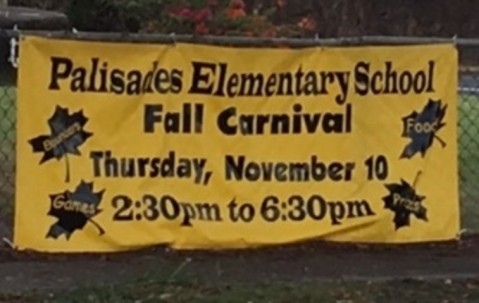The Palisades Elementary School PTO is presenting the school's 2016 Fall Carnival this Thursday, November 10 from 2:30-6:30PM on the school campus grounds. Thursday's Fall Carnival will feature games, baked goods, foods, an obstacle course, bouncers a reverse dunk booth, and craft vendors.