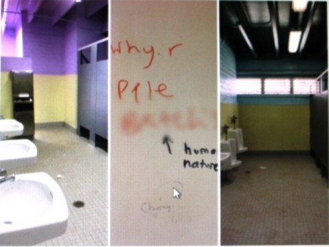 "Graffiti left by students mark the walls of the school's bathrooms."