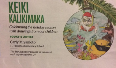 Earlier this year she entered her hula students in the Brown Bags TO Stardom and Spotlight Competition and brought home 2nd place for both. Recently, our mother had one of her arts and crafts student, Carly Miyamoto, enter the Honolulu Star Advertiser Keiki Kalikimaka annual contest. Carly was selected as one of the 30 finalist and was featured in the newspaper last Sunday.