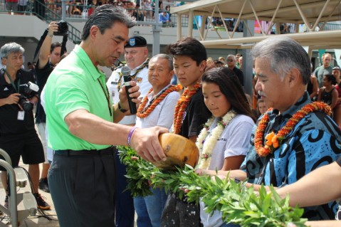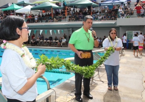 Kahu Davis is pictured blessing the K. Mark Takai Diving and Swimming