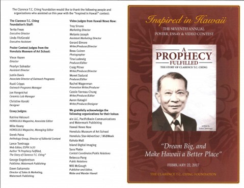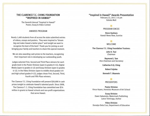 Wednesday evening, February 22, at the "Inspired by Hawaii" 7th Annual Poster, Essay & Video Awards Ceremony, presented by the Clarence T. C. Ching Foundation, held at Kahala Mall; winners of this contest were announced.