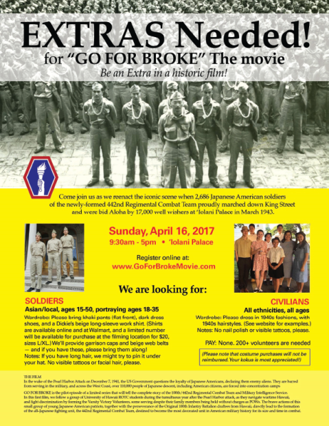 We need 200 civilian volunteer extras for the last scenes of the GOFORBROKE Movie. This is a legacy film about 442 Regimental Infantry Team. Location is Iolani Palace grounds and King St. The call is for Sunday, April 16. Movie is being dedicated to Mark Takai because he helped the Producer, Author and Screen Writer to get funding to produce this Movie. We would like to see Team Takai in this movie.