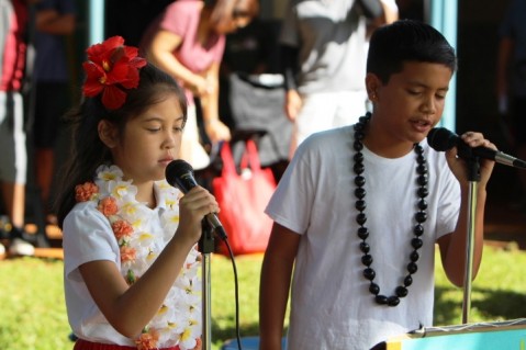 Amethyst Galarse-Pancoast and Jahsiah Kime served as Ho'ike 2017 emcees. Students from No Na Haumana O Ke Kula Ha'aha'a O representing grades 4-6 performed the Ho'ike school chant.