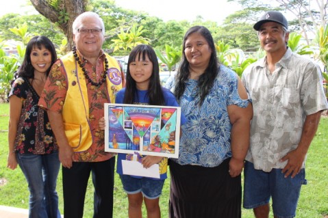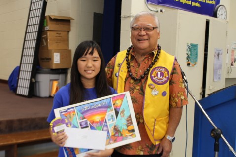 Miyamato was presented a recognition letter and a $100.00 check from Pearl City Lions Club President Clarence Nishihara for winning first place in the Lions District 50 Sight is Beautiful poster contest. Miyamoto won the school level, zone level, and state level for grade six. She is also a member of Palisades Elementary after school Ukulele and Hula Club taught by Makua Leilani. Makua Leilani recognized Miyamoto's art talents back in kindergarten when her asrtwork was chosen for the school's May Day program t-shirts.