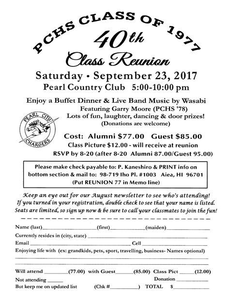 IT'S ALL SET! PEARL CITY HIGH SCHOOL CLASS OF '77 IS GOING TO ROCK ON SATURDAY, SEPTEMBER 23, 2017. CHECK OUR REUNION FLYER BELOW TO SIGN UP FOR A GREAT NIGHT CELEBRATING OUR 40TH REUNION WITH CLASSMATES!