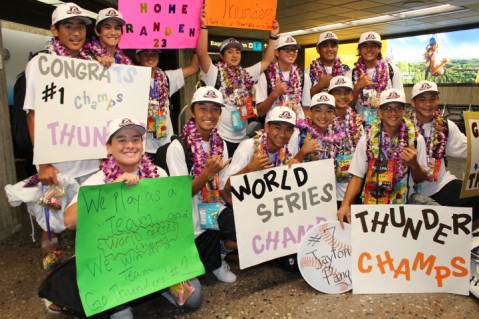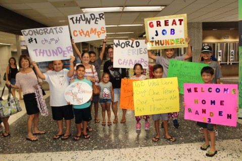 The Pearl City Thunder 2017 Babe Ruth 14U World Series Champions touched down at Daniel K. Inouye International Airport this afternoon and were greeted by an overwhelming show of support, appreciation, love and Aloha by family and friends as everyone came together in celebration at the baggage claim area.