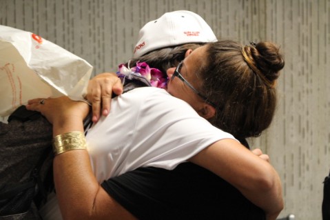 A well deserved lei and hug!