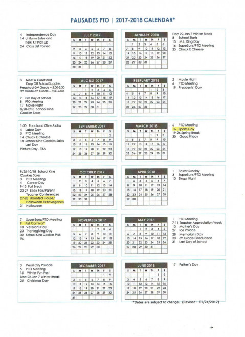 A big mahalo to Shannon Teves for providing the Palisades PTO calendar of events below: