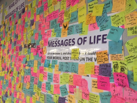 I would like to say thank you to everyone who has posted on our Pearl City Messages of Life – Healing Wall at the Pearl City Shopping Center. The messages are truly amazing and an inspiration to all. It’s a truly humbling experience each day as I visit the wall to replenish the pens, post its and tape while having an opportunity to spend time reading the messages, as well as talk story with the writers and contributors to the wall. I’ve made a lot of new friends while catching up with old friends at the wall.