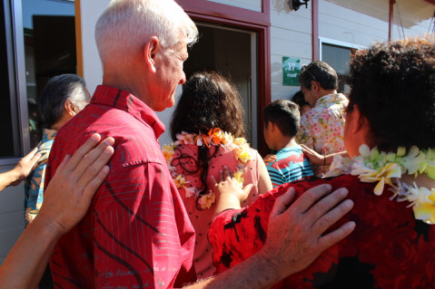 When I arrived Friday morning on the Kahauiki Village property, I came upon my boss Duane Kurisu as Nohealani Ching arrived with her children and another family. Excited and with tears of gratitude, the two families were a little less than hour away from moving into their brand new homes that they will rent for about $700 – $900 a month (utilities included.) Nohealani greeted and thanked Duane for their blessings and for changing their lives with the opportunity to live as a family at Kahauiki.